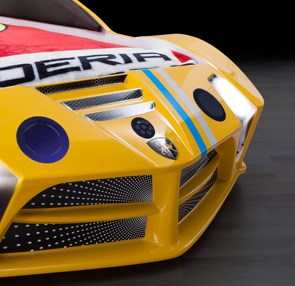 Conçu pour un matelas standard de 90 x 190 cm , ce lit propose des fonctions télécommandées. Quatre modes sont disponibles : bruit de moteur, contrôle de la lumière, effets lumineux et musique façon télévision, stimulant l’imagination des enfants et transformant leur chambre en un espace encore plus ludique.